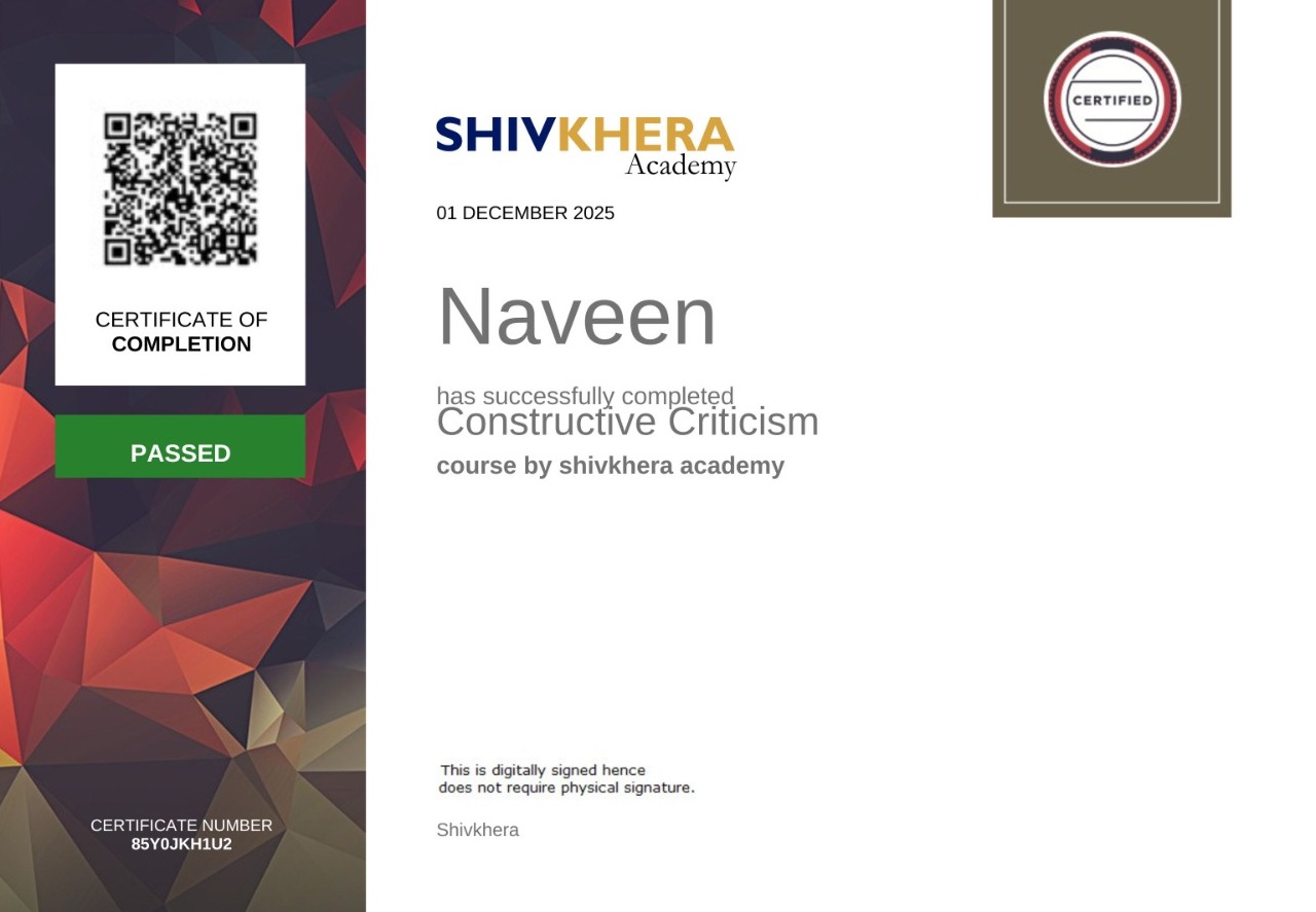 In this powerful course by Mr. Shiv Khera, an international best-selling author of over 13 million copies sold and a highly acclaimed leadership and business coach, you will master the art of giving and receiving constructive criticism to foster growth, enhance communication, and strengthen relationships. This course reveals how honest, respectful feedback fuels personal and professional development while maintaining trust and motivation. Through Mr. Khera’s engaging stories, practical techniques, and real-world examples, you’ll learn to deliver feedback with confidence and openness, creating a culture of continuous improvement and mutual respect.